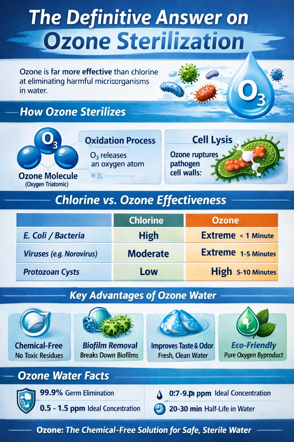 Da, ozonul este una dintre cele mai puternice și fiabile metode de sterilizare a apei disponibile astăzi. Este mult mai eficient decât clorul tradițional în eliminarea unui spectru larg de amenințări biologice. Când se dizolvă în lichid, apa cu ozon funcționează ca un dezinfectant de nivel înalt care poate realiza a Reducere cu 99,9% a microorganismelor dăunătoare , inclusiv bacterii, viruși și protozoare, adesea în câteva secunde de la contact.