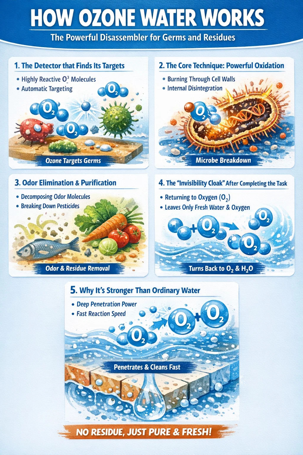 Apa cu ozon funcționează ca un agent de curățare cu un „dezasamblator puternic” încorporat. Spre deosebire de apa obișnuită cu săpun, care pur și simplu spală murdăria, descompune complet germenii la nivel microscopic.